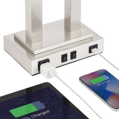 Combine style and convenience into one with this brushed nickel table lamp that includes an integrated USB port and power outlet in the base for you to charge your smartphone, tablet, laptop or other devices. This design takes the classic column lamp and makes it decidedly modern with its brushed nickel finish. Control the lighting levels with the two individual switches on the base.