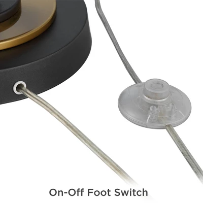 With its sleek, tapered profile, this modern torchiere floor lamp adds a pop of visual style to any setting. The design features a cone-shaped body and a torchiere style light that directs illumination towards the ceiling to brighten entire room areas. The cone shade is in off-white linen, and it has antique brass and gunmetal gray finish metal accents. Easy lighting control comes from an on-off foot switch.